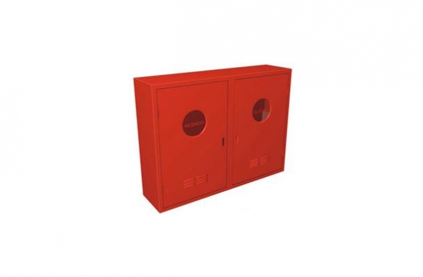 Abrigo para mangueira externo, confeccionado em chapa de aço com acabamento na cor vermelha.