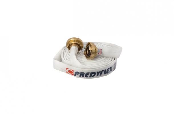Mangueira de incêndio 30 metros com reforço têxtil, confeccionado 100% em fio de poliéster de alta tenacidade, tecimento diagonal (tipo sarja), na cor branca com tubo interno de borracha sintética e dotada de uniões tipo storz.